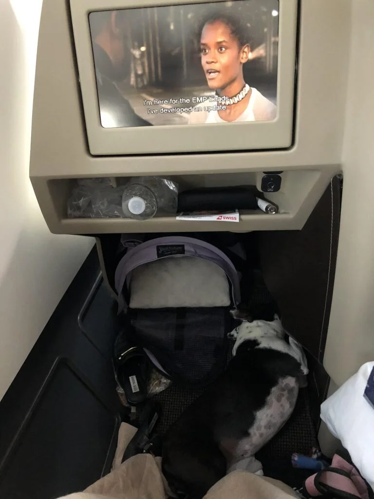 Once we got to the airport and through security, we went up to the SWISS Business Class lounge to enjoy the spoils of flying Business. We sat down in a beautiful lounge area, John with his cappuccino and I with a glass of champagne , and we sighed a big breath of relief – all the months of intensive planning for this moment, it was finally upon us. We were finally here, and everything was perfect. And that’s when Daisy started bucking like a wild horse to her out of her carrier and barked at every nice steward that came by. She was anxious, panting, whining, chirping, barking – literally my worst nightmare. Everyone in the Business Class lounge turned and gave us unsympathetic death stares . A few waiters and waitresses walked by with horror. Sweating from embarrassment, I begrudgingly chugged my nice champagne and we left the Business Class lounge. The next hour and a half was spend doing laps in Terminal E trying to get all the anxious energy out of Daisy.