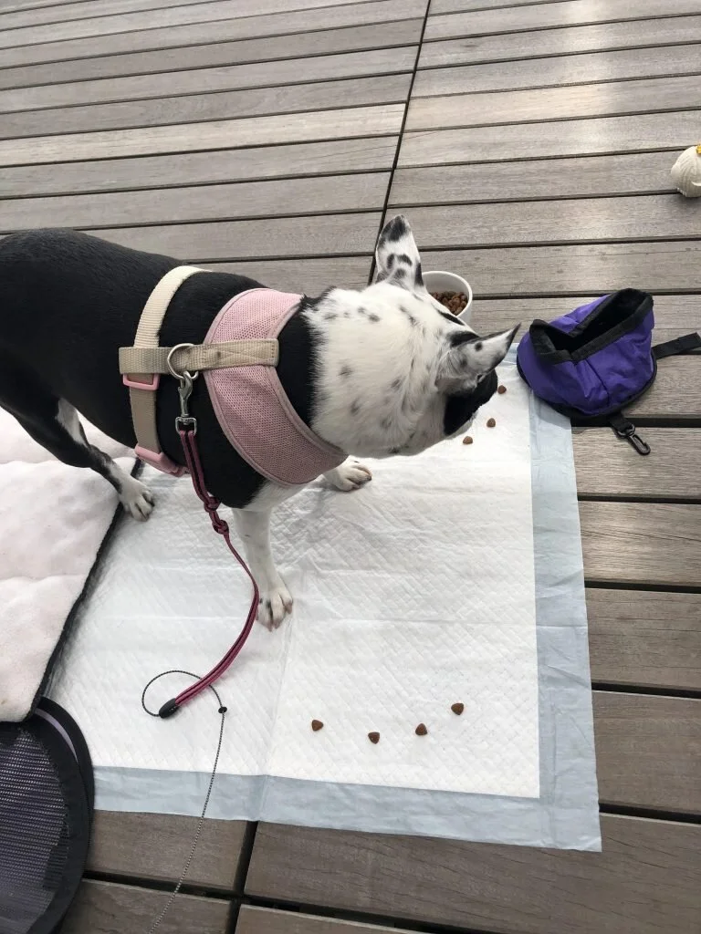 We had to play with her food to get her to eat! She also thought the pee pad was a nice play to lay down.