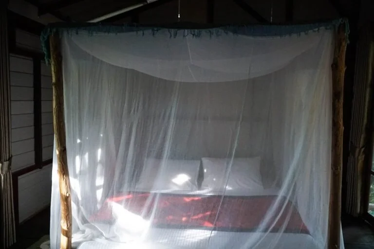 We fell asleep under the mosquito net in a comfortable, rustic style bed. We fell asleep to all the sounds of the jungle. In the middle of the night, a cat started howling outside which made John shoot straight up. I slept right through it