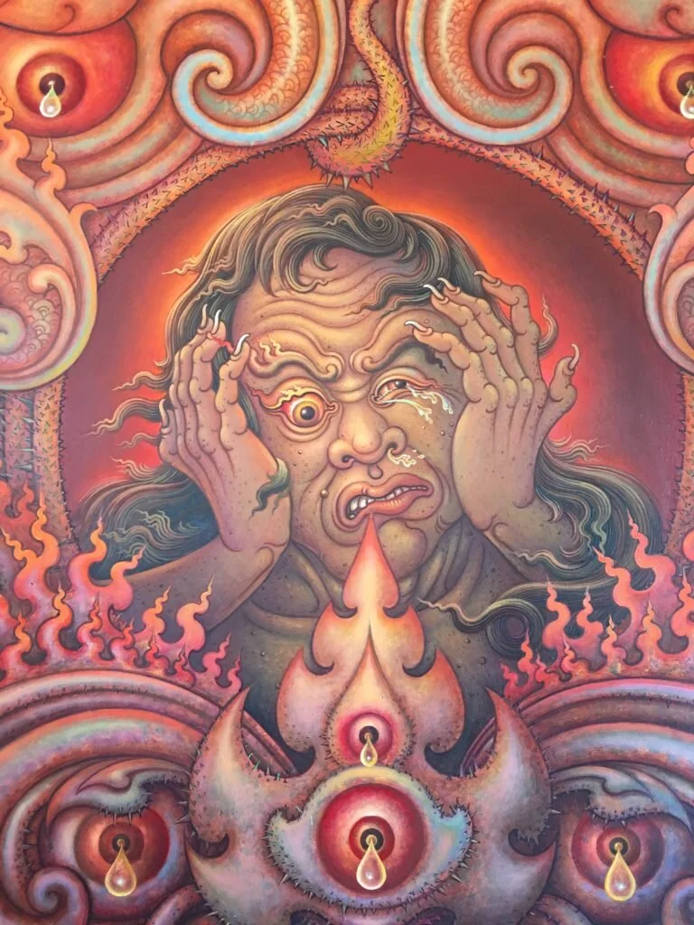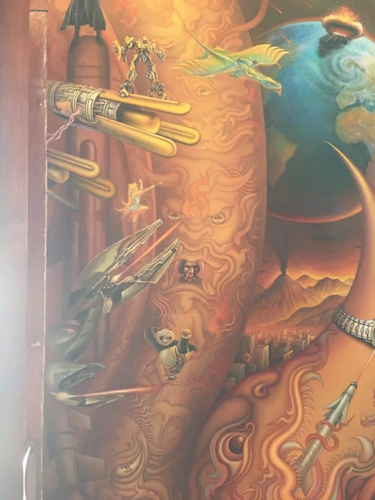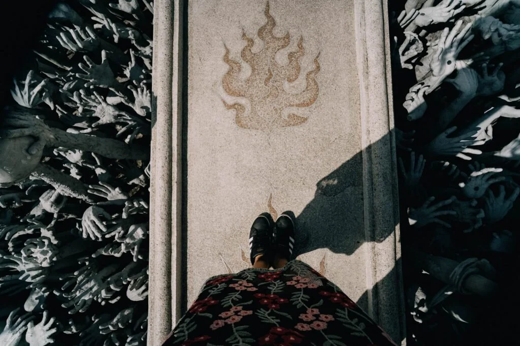 What’s even more quirky is the inside of the White Temple. The inside of the white temple is contrasted by bright, orange murals from classic Thai characters to Western idols such as Michael Jackson, Harry Potter, Hello Kitty, Neo from The Matrix, and Freddy Krueger. Images of nuclear warfare, terrorist attacks, and oil pumps hammer home the destructive impact that humans have had on earth.